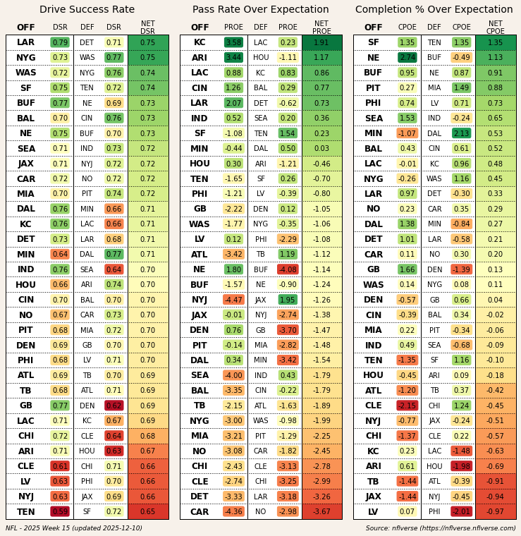 At the macro level, which we all know and love, we have the highest over/under game of the season in Lions // Rams at 55.5(!). That can’t be overstated, as by my count it’s at least a few points higher than any other game we’ve seen this season. Two potent offenses, with the Lions more concentrated than ever, and two defenses that either yield a lot of yards (Lions) or are set in their schemes (Rams). Translation: points are coming, even if salaries will be hard to fit in together. I’m not suggesting you overload or ignore this game, but any breakdown of Week 15 should start here.