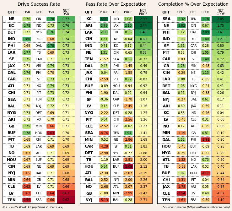 On the NFC side at this point last season, five of the seven teams in the picture before Week 12 made the playoffs at the end of the year, as well. If you haven’t guessed (or looked back in your inbox), we talked about the long-term predictability of the season and used the playoff pictures as the proxy in this space in 2024. What’s remarkable to me in looking back is that 12 of the 14 teams continued, over the course of the next seven weeks, to maintain their positions, and the AFC was basically stagnant across the same time period.