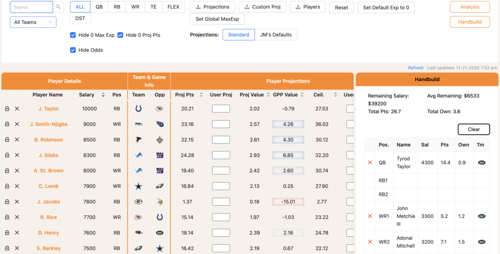 The screenshot below shows a locked-in set of Tyrod + Metchie + Mitchell (click the “Handbuild” button to open that pop-up with the roster, lock in the players you want, then run a set of rosters), on which I ran 100 rosters.