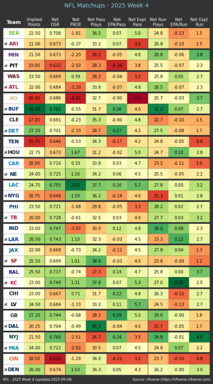 You have to start somewhere, and these four games plus the Bills and Lions seem to be where points will come from. There are always going to be more angles to play, and some other notable matchups will include the Chargers // Giants, Commanders // Falcons, and Eagles // Buccaneers.