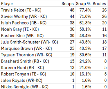 In the passing game, Rashee Rice made his return, promptly scored 2 touchdowns, and then only played 41% of the snaps because the Raiders rolled over and died. So it’s hard to know how things are really going to shake out in this receiving corps, but one thing we can look at is the data around snaps and routes just through the first three quarters of the game: